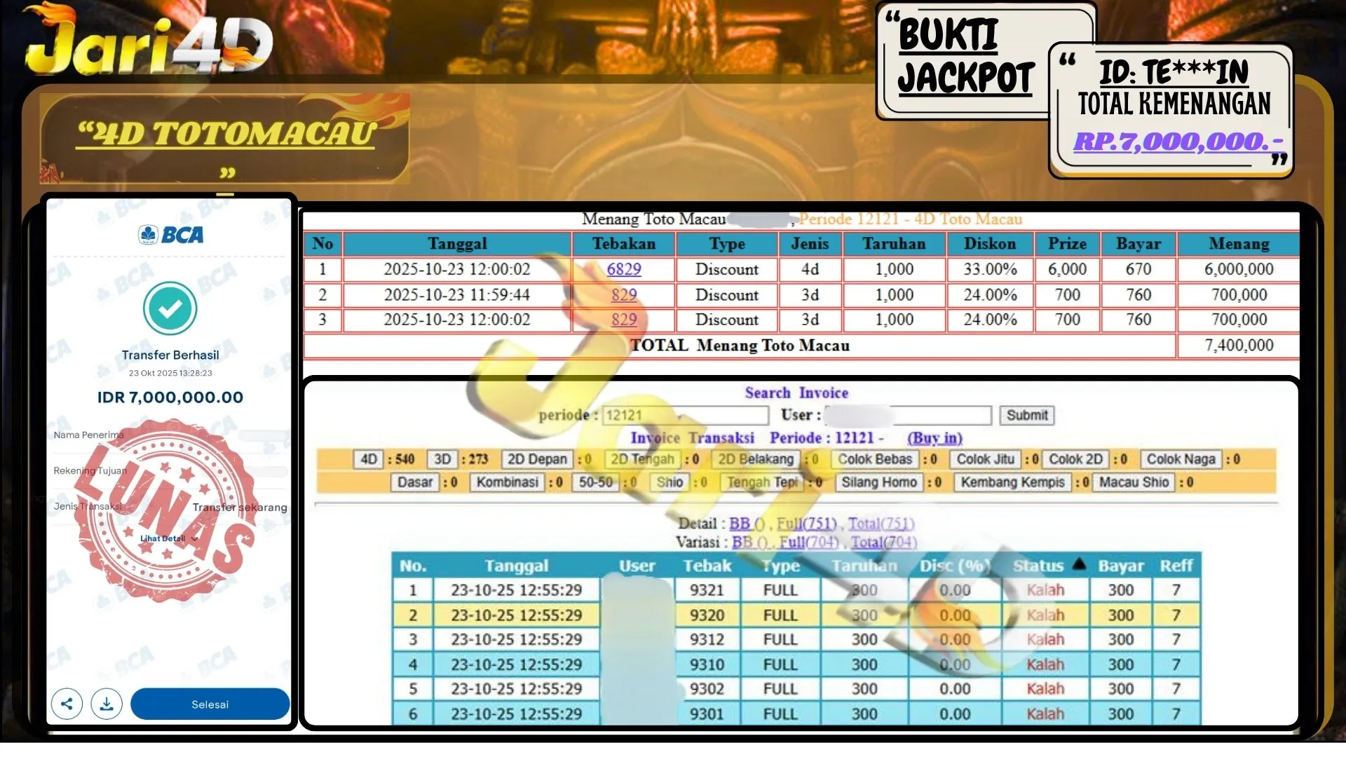 Bukti JP 4D TOTOMACAU Hari ini Di Situs JARI4D Sebesar Rp.7,000,000,- Tuntas !!