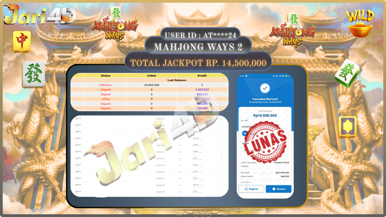Bukti JP MAHJONG WAYS 2 Hari ini Di Situs JARI4D Sebesar Rp.14,500,000,- Tuntas !!